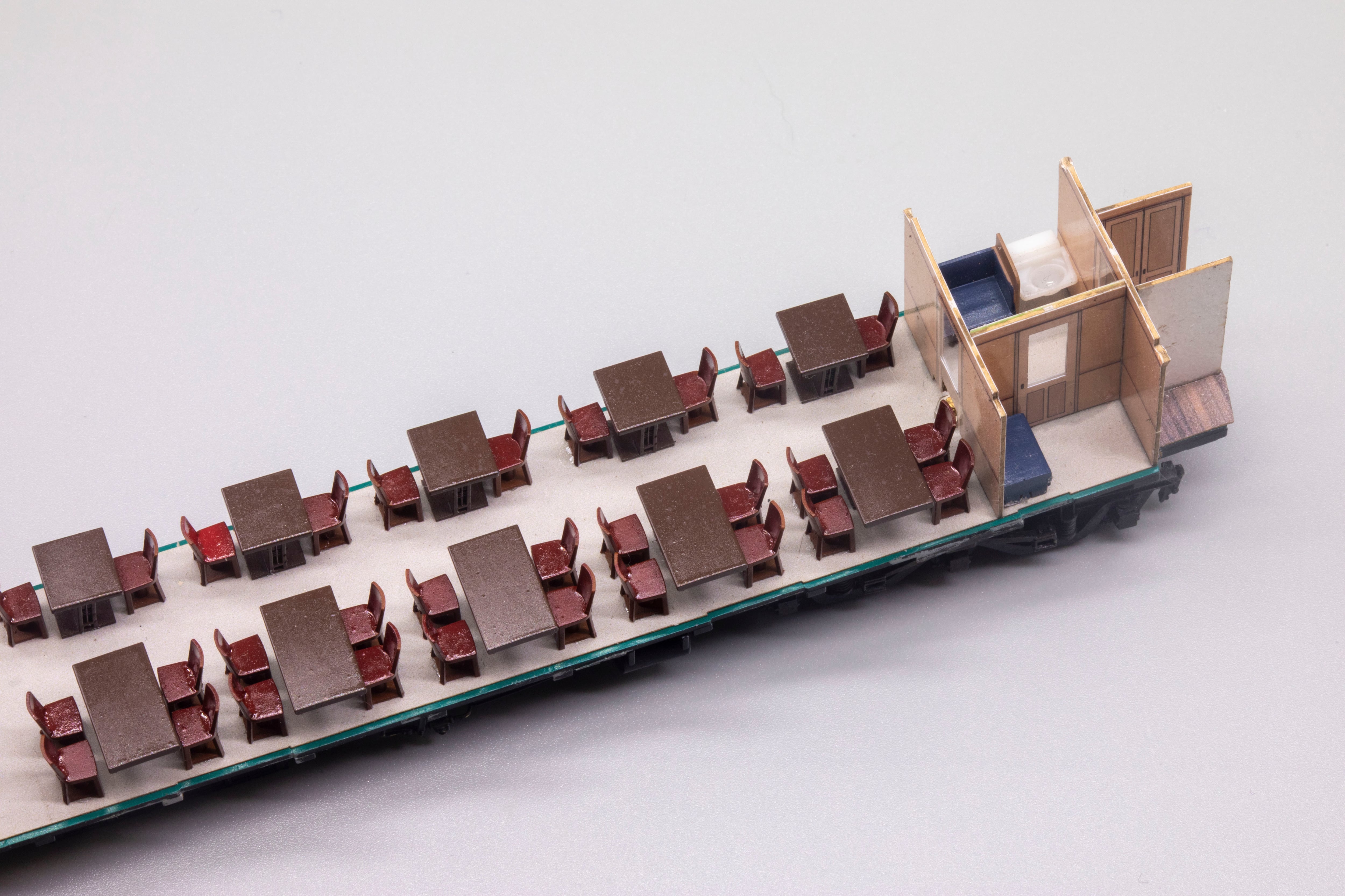 キッチン内部や椅子、テーブル、喫煙席に至るまで忠実に再現。洗面は白樹脂にて制作しているため、塗装の手間を省けます。