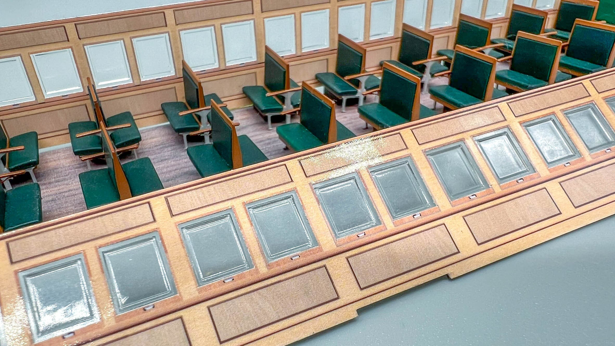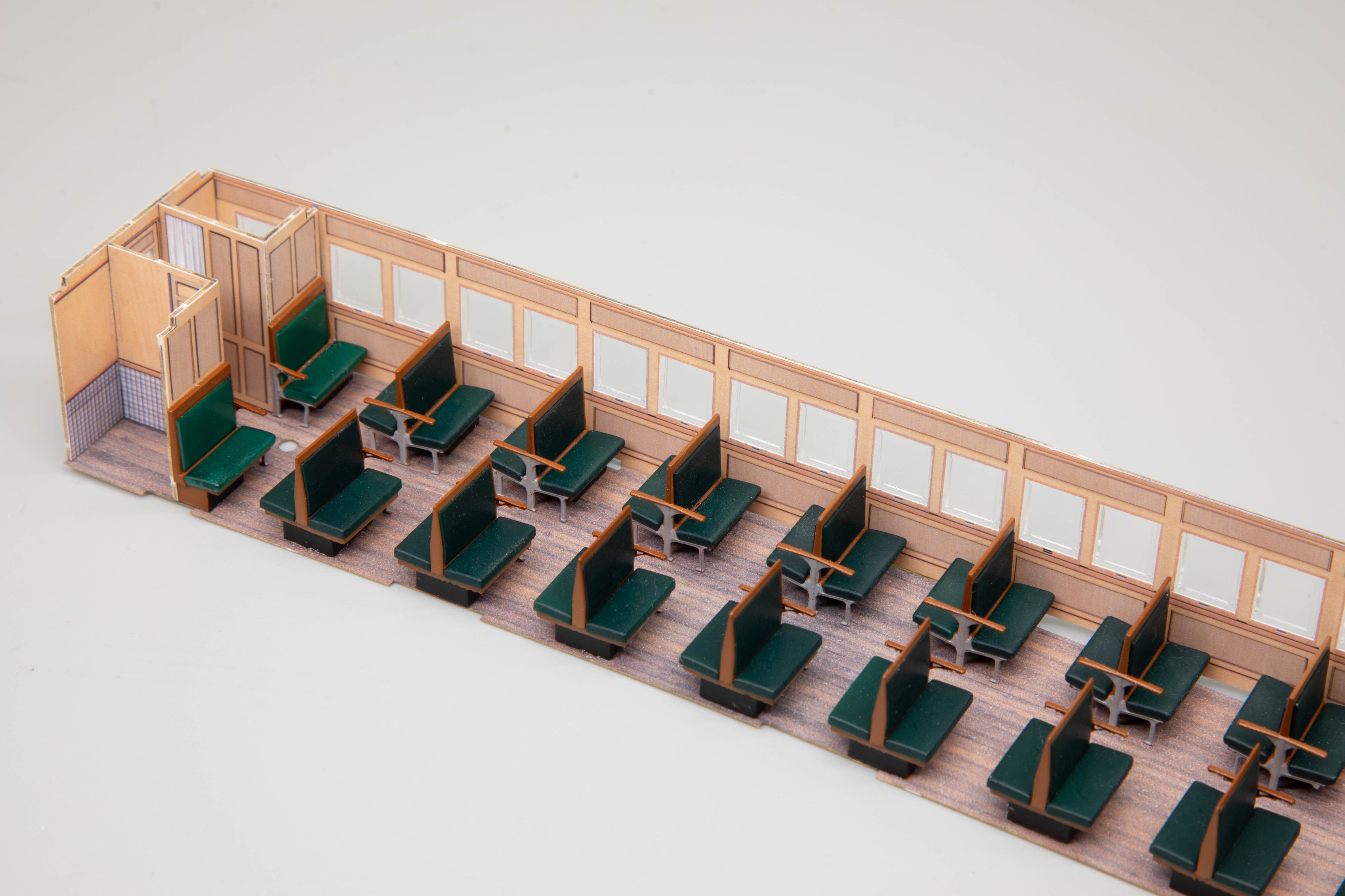 忠実に再現された3等座席はモケット、手すり+台座の3ピース構造。マスキングの手間が省け、綺麗に塗装できます。
